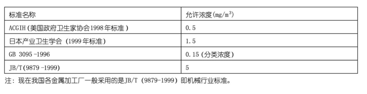 車間油霧濃度的控制有以下標準: